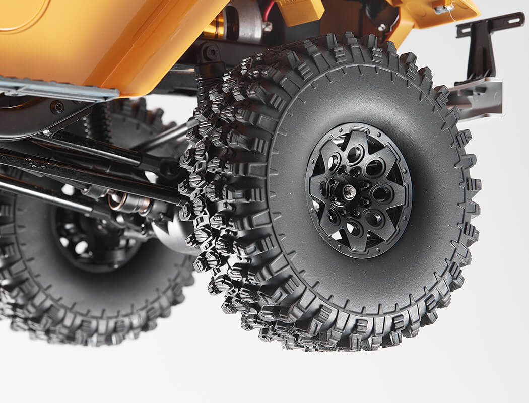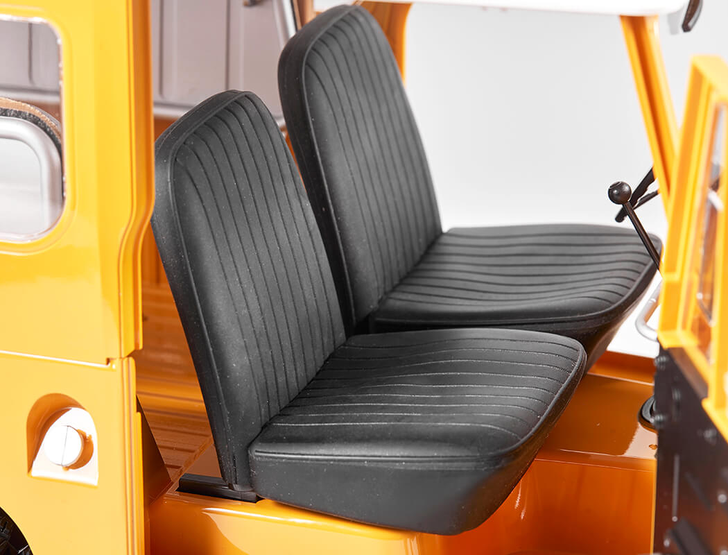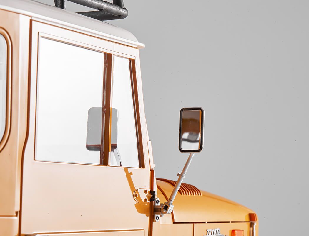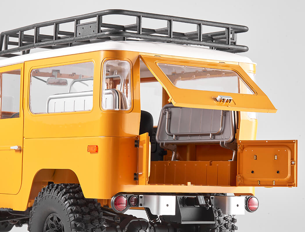 1.9″ climbing tires allow for good grip on all terrains. The four-link suspension system ensures a larger shock absorber stroke and better pass-ability. Metal trapezoidal beams provide a solid supportive structure. Even with the ABS hard body and full interior, the vehicle can easily overcome extreme road conditions. The real FJ40 uses leaf spring suspension. For those who pursue extreme simulation, the chassis can be installed with leaf spring suspension (sold separately) to restore the style of the real vehicle. Pursuing the needs of climbing performance and restoration seems to be impossible, but through the compatible design of the chassis and the replacement of a few accessories, it can take on a completely different shape.