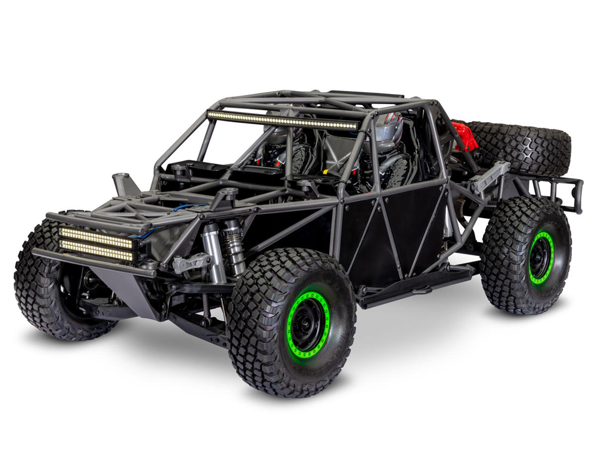 The Traxxas UDR boasts a large Pro Scale® body packed with highly detailed replica parts that elevate realism and durability. Its heavy-duty truck body mounts secure to a functional tube frame chassis modeled after full-size trophy trucks. The detailed interior features lifelike driver figures, while scale components like brake calipers, seventeen millimeter wheel hubs, dual working spare tires, a spare driveshaft, and accessories such as fire extinguishers, shock reservoirs, a jack, and tools enhance its authentic appearance. Realistic side plates complete the rugged, true-to-life design, making it a standout in both performance and visual appeal.